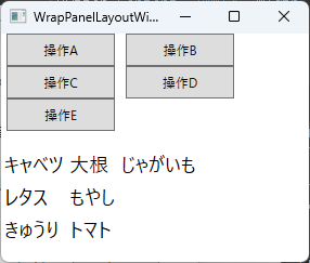 WrapPanelLayoutWindow.xamlは、前回StackPanelで使用したサンプルをWrapPanelに変更して、折り返しがわかりやすくするために、ウインドウサイズを縮めます。